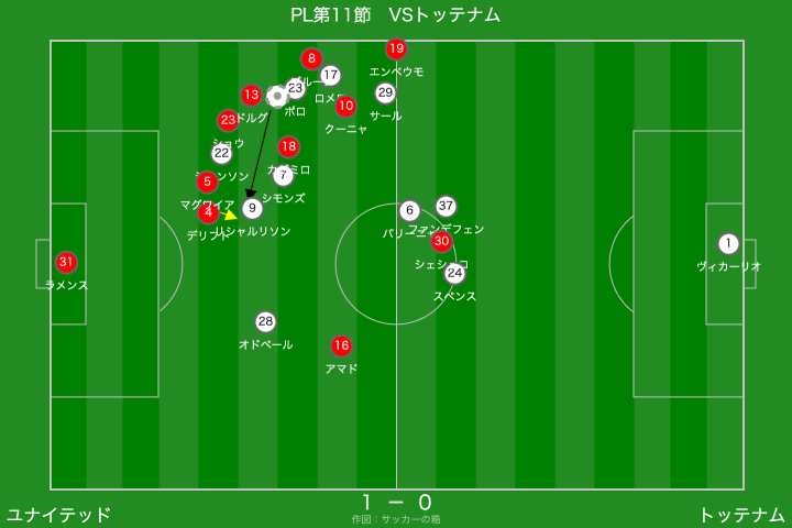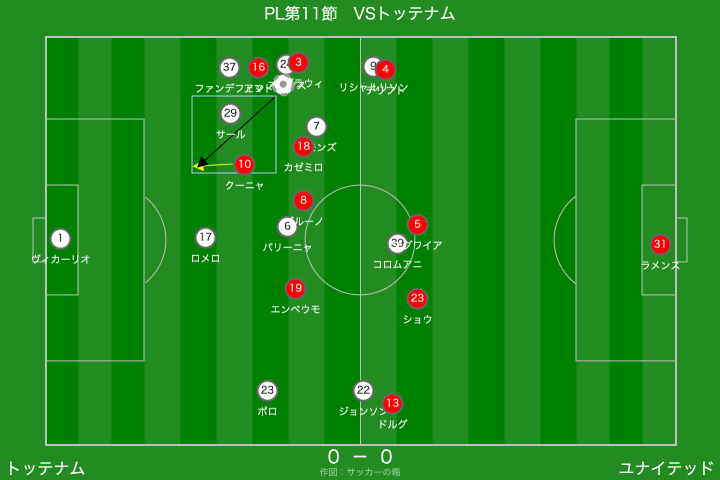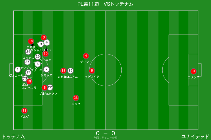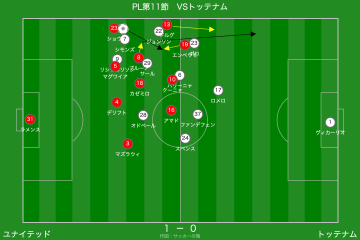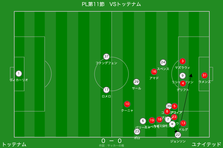 この辺りから、ユナイテッドのプレスがハマるようになりました。トッテナムは、思っていた以上にビルドアップにこだわってくれていたおかげで、ユナイテッドは守りやすかったように思います。