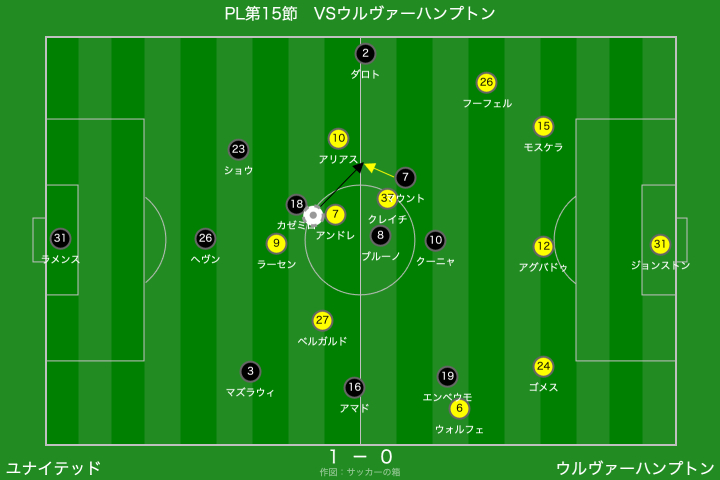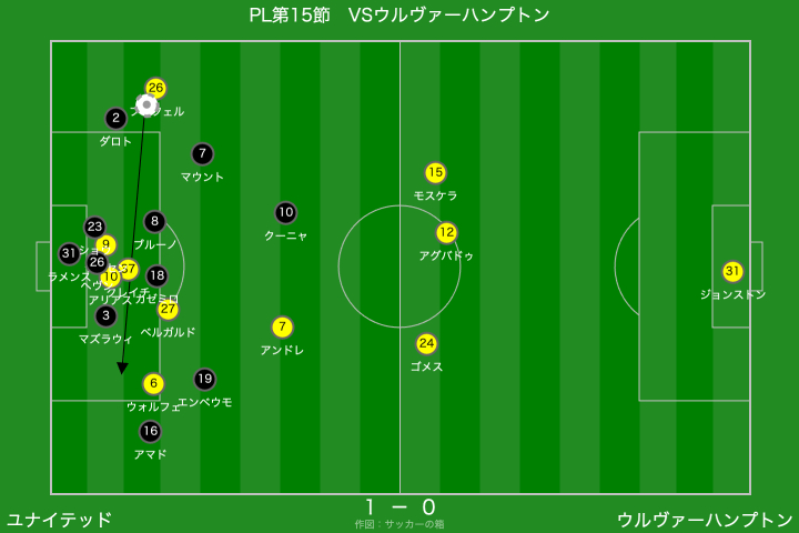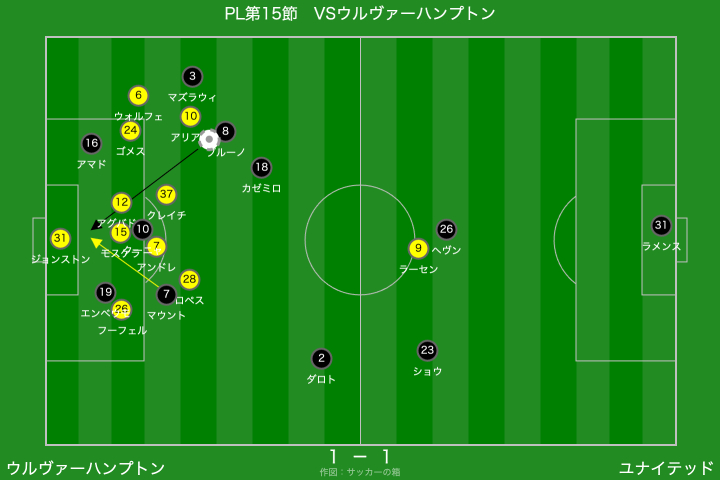 右からのクロスに対して、アマドの寄せが甘くウォルフェをフリーにしてしまったのは良くなかったですね。本職WGなので、守備に多くを求めることは酷ですが、アマドがマークを外してピンチとなるシーンが目立っていますので、改善が必要です。ファーサイドのケアが緩慢なのは、アマドに限ったことではないですが、、、