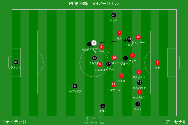 サカに対してはカゼミロとドルグがマークに入りましたが、サカは巧みな浮き玉のパスでウーデゴールへ展開します。