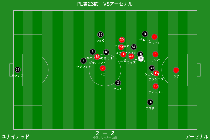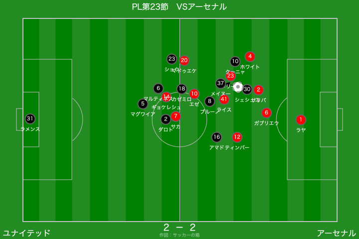 後半は、一転してユナイテッドが押し込む展開が目立ちます。後半に入ってから、ユナイテッドの選手たちの運動量が上がったように見え、全員がサボらずにプレスを掛け良い距離感でプレーできていたことで、アーセナルはビルドアップできていなかったですし、蹴ったボールに対してユナイテッドがセカンドボールを回収する場面が目立ちました。そして、その流れのままユナイテッドが逆転に成功します。
