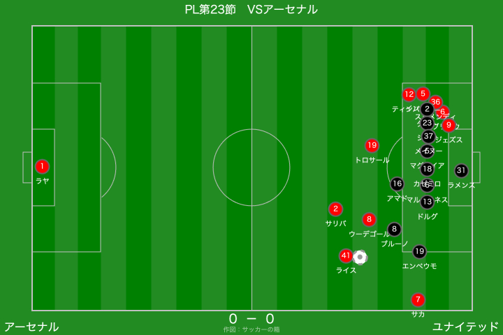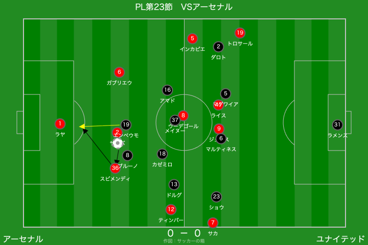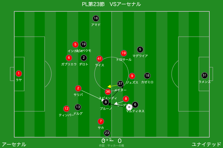 前半、アーセナルは非常に強度の高いプレスをかけてきました。ユナイテッドは特に、ウーデゴール、サカ、ジェズスの連動したプレスに苦しめられ、なかなか思うように敵陣へ進入できない時間帯が続きます。