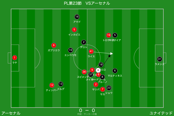 ジェズス、ウーデゴールと繋がれ、ダロトが上がっていて絞っていたマグワイアの開けた中央のスペースに走り込んだライスにいいボールが渡ります。