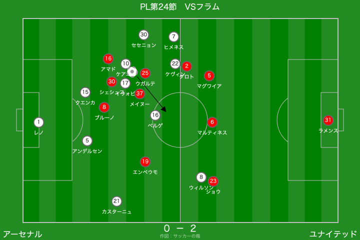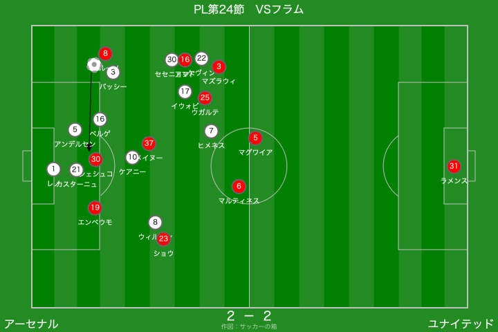 フラムのスルーパスが流れたところをアマドが拾い、マグワイア、マルティネスとボールを繋ぎます。マルティネスが前を向いて持つと、エンベウモが素晴らしいタイミングで最終ラインの裏へランニング。マルティネスはその動きを見逃さず、正確なロングボールを供給します。