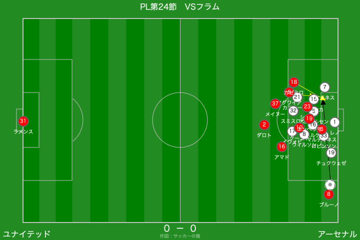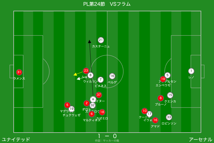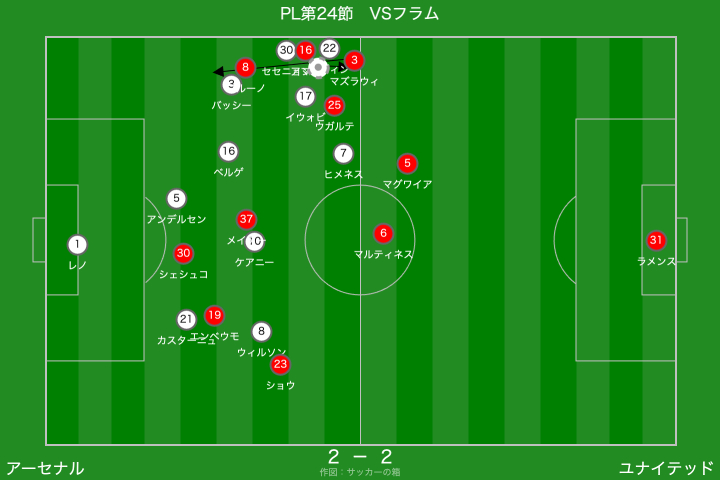 一方のフラムは、選手の立ち位置を修正してきていました。ウィルソンが中央寄りのポジションを取る一方で、空いた右サイドにはカスターニュやイウォビが流れてくる形。前半はウィルソンがあまり効果的にボールに触れられていなかったため、その点を踏まえた修正だったように見えます。