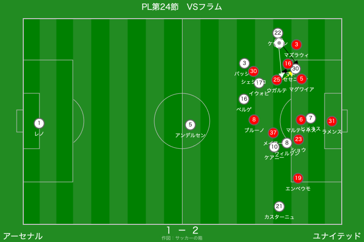 クーニャがイウォビを深追いして右サイドに流れて来たのですが、メイヌーもカゼミロも全員が右サイドによっていて、さらにヒメネスがユナイテッド側の左サイドに流れて来ていたこともありマルティネスまで右サイドに釣り出されていました。結果、ユナイテッド側の左サイドにショウしかおらず、ショウもウィルソンのマークでカスターニュに誰もマークがつけない状況に。