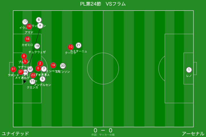 フラムのクリアボールをマズラウィが回収し、落とした先はマルティネス。マルティネスは迷うことなく、前線のアマドへ正確なフィードを送ります。