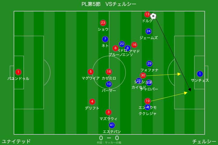 前節からは、クーニャとマウントの負傷離脱もあり4枚の変更がありました。ビックゲームでは珍しく、カゼミロではなくウガルテがスタメンに選ばれました。また、右WBにはマズラウィ。左シャドーにはアマドが起用される謎采配。ワントップでは、シェシュコがプレミアリーグ初先発を飾りました。プレシーズンを見ている限り、ザークツィーがフィットしそうだと感じていましたが、アモリムの中では違ったようです。